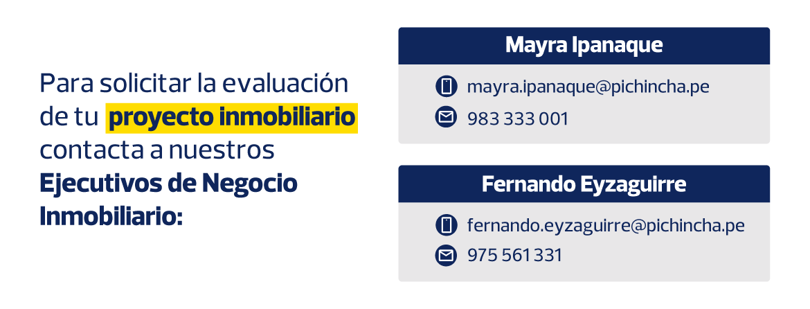Una vez que el Banco Pichincha aprueba el financiamiento, y de acuerdo a su tamaño, se asignarán los ejecutivos a cargo de su proyecto para brindarles el apoyo necesario en las ventas, así como el material publicitario del banco.